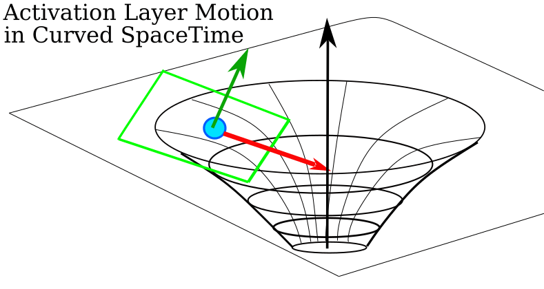 General relativity does not need anything outside of our Activation Layer hypersurface (although it is clear that the hypersurface must curve according to Einstein’s stress-energy tensor equation). You can see this if you look at how stress-energy tensors are defined as 4 dimensional entities, such as a t,x,y,z functional matrix. All contributions to the stress-energy tensor at a given point must either be local or propagate causally through the Activation Layer. This tensor then sets up spacetime curvature via a 4 dimensional metric, that when multiplied by a translation or rotation operator defines how that translation or rotation occurs within that curved spacetime–but within the Activation Layer hypersurface. We can then use LaGrangian equations of motion or other tools to find the path (e.g, a planetary orbit) taken in our potentially curved hypersurface.
