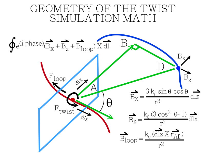 PPS:  Update–getting closer.  I’ve worked out the equations, hopefully correctly, and am in the process of setting them up in Mathematica.  If you want to make your own working sim, the two forces sum to a flux field which can be parametrically integrated around whatever twist paths you create.  Then the goal becomes to try to find equipotential curves for the flux field.  The two forces are first the result of the axial twist, which generates a plane angle theta offset value Bx = 3 k0 sin theta cos theta/r^3, and Bz = k0 ( 3 cos^2 theta -1)/r^3.  The second flux field results from the closed loop as k0 dl/r^2).  These will both get a phase factor, and must be rotated to normalize the plane angle theta (some complicated geometry here, hope I don’t screw it up and create some bogus conclusions).  The resulting sum must be integrated as a cross product of the resulting B vector and the direction of travel around the proposed twist path for every point.