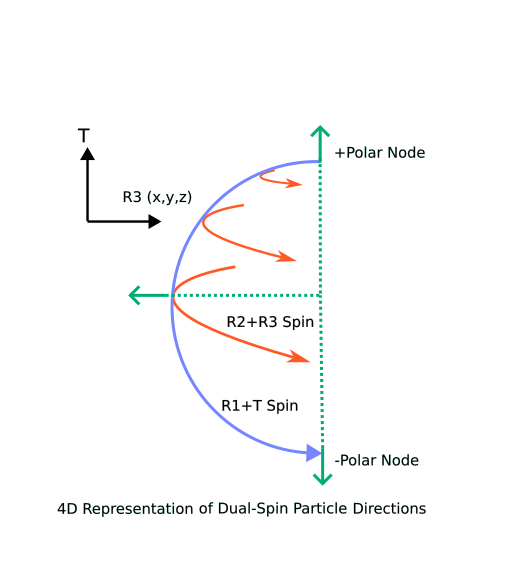 I shamelessly speculate this is why we experimentally observe the appearance of three bound quarks in a proton and two bound quarks in a kaon, yet never observe isolated quarks. Dual spin particles rotating in the four dimensions of R3 and T provide a possible path to modeling the internal behavior of bound quarks. This is only the beginning–there are many possible rotation ratios that I think enables the entire particle zoo (both fermions and hadrons), and things like the 1/3 and 2/3 charge values emerge from this model.