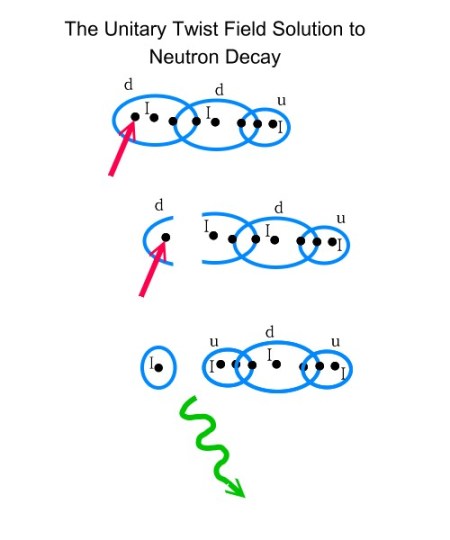 The neutron case is a lot more interesting, I don’t have an answer but I continue to think about it. My leading hypothesis is that the proton-neutron combination is actually some unique combination of linked rings that can decay into separate particles (free neutron and proton).