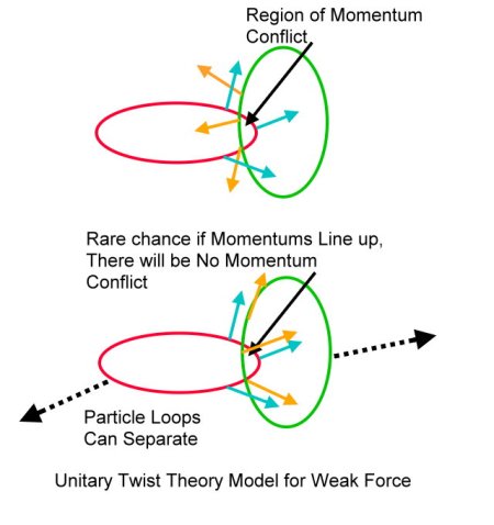 So–a roadblock to getting good sim results, but often working out details of the sim yield insights to the actual model. One thing I noticed about the twist field model (not the sim of the model) is that there is a very small probability that two twist rings will collide in such a way that the twist rotation angle happens to be identical. If this happens, there is sort of a quantum tunneling effect where the two rings can separate if a random jiggling of the rings hits this coinciding angle rotation. At that point, the rings would have to disintegrate or form other loop combinations (my hypothesis) because the ring energies are not correct for stability on their own. I originally thought this was a fatal flaw in the linked ring idea for quarks–but then I realized that the vast majority of quark combinations are not stable, they decay via the weak force. Up to now, I couldn’t see any way to get the Unitary Twist Field to model the random effect of the weak force, but this is a great solution, I think! The random thermal motion of our existence would be constantly pulling and pushing the linked rings in a very chaotic way, and every once in a while the ring rotations at the point of collision would line up and cause a dramatic breakup of the linked structure. Just about all of the linked quark combinations experience decay in varying amounts of time, and this model of the unitary twist field provides a means for this to happen.