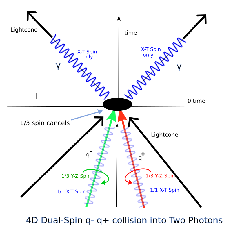 For a very long time, I tried to use this R3 + I rotation vector field to model particles. Photons are self evident since linearly propagating quantized twists were the motivator and basis of the theory. Trying to extend this idea to electrons ran into trouble, however. For a long time I believed that the electron set, the four identical variations: spin up e-, spin down e+, spin up p+, and spin down p-, forced the corresponding R3+I models to be dipoles. This runs into conflict with the experimental observation that electrons are point particles. I tried for years to work around this but in the end concluded that a Compton radius dipole cannot represent an electron–it’s too big, and predicting scattering would have to fail to match experimental observation. Whatever model I come up with has to be a point particle model, and for a while I could see no way to get the four electron variations.