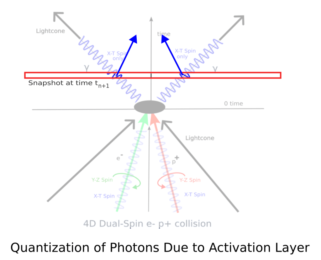You can increase the radiation intensity by adding more nearby rotation vectors, but this still is a quantized step. You might say, well, just increase the magnitude of the vectors, but we know we can’t do that because the photon energy is only a linear function of its frequency, E=hv. There is no magnitude degree of freedom. This isn’t just for photons–every single elementary particle has to be quantized via a single vector within our 3D slice of 4D spacetime. We don’t need the (questionable) lowest energy rotation state idea for quantization or a bogus gaussian packet description, our 3D hypersurface activation layer does the quantization for us!