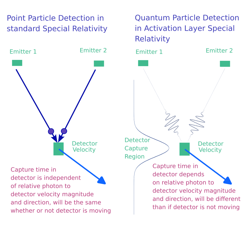 Fig 1. In the Activation Layer case, photons and the detector are quantized size, and the time to be absorbed is a function of the detector frame of reference. As a result, the two photons may arrive at the detector at the same time, but detection times will be dependent on the detector velocity and will always be different for different detector frames of reference.