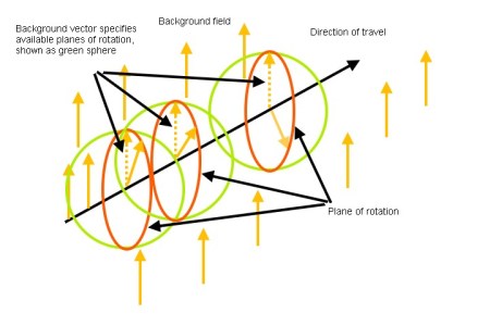 I discovered that the aforementioned precursor field can form either of two types of stable potential wells. The fact that the precursor field is directional only, thus field values cannot go to zero, combined with the omnipresent tendency to go to the default background state, leads both to quantization (only full integer twists out of and then back into the background state are stable) and to the formation of stable potential wells around either the background state or its opposite. I found that the background state tendency can be described as a force that is strongest when an element’s direction is normal to the background state, but is zero at either the background state or its opposite! It turns out it is nearly linear and thus forms a potential well near both zeroes. Thus a stable particle can form around a negative background state pole. You could also form a stable positive pole in a negative background state region (think antiparticles), and could even link together or overlap multiple particles in a chain or set of rings and have the result be stable. I can even visualize spontaneous formation of particle/antiparticle pairs so crucial to QFT, but that’s jumping the gun a bit right now.