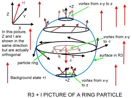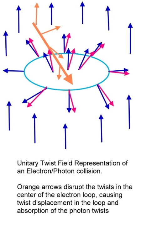 And to this end, I have discovered some great properties of this field. The field so far shows the right degrees of freedom to produce linear and closed loop particles, shows why quantization occurs (the lowest energy state of the field is the +I rotation direction, confining twists to integer multiples of complete cycles) and clearly shows how the two types must interact. Since (see previous posts) the field is blocking, a linearly propagating twist rotation through +I will propagate until it encounters a closed loop twist in this field. Non-unitary fields such as an EM field permit varying vector magnitudes, including regions with zero magnitude. In that type of field, there is no possible way that a linearly propagating twist can intercept and be absorbed by a closed loop through the center (think photon striking an electron). But a unitary twist field, as shown in previous posts, has a very specific stable configuration of rotations that must exist in the center of the loop. When a linearly propagating twist tries to collide with the closed loop, it cannot pass through (remember that unitary rotations cannot linearly combine, there is no magnitude other than 1). It will pass its momentum components to the rotations in the loop, but cannot dissolve the loop unless the momentum of the linear particle approaches the momentum of the loop components and breaks the loop. I know this sounds like handwaving, but I think if you do your own analysis of this field you will find this to be true.